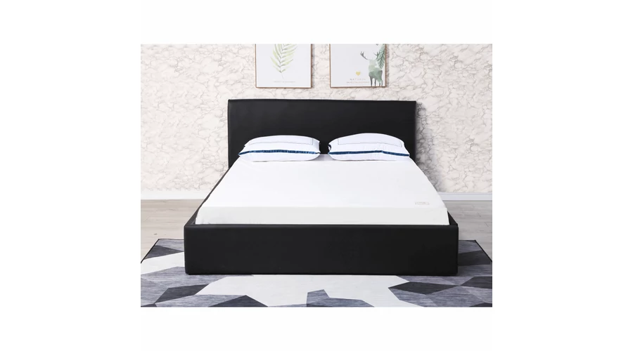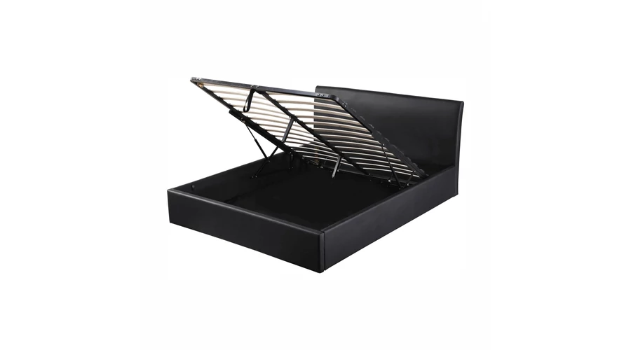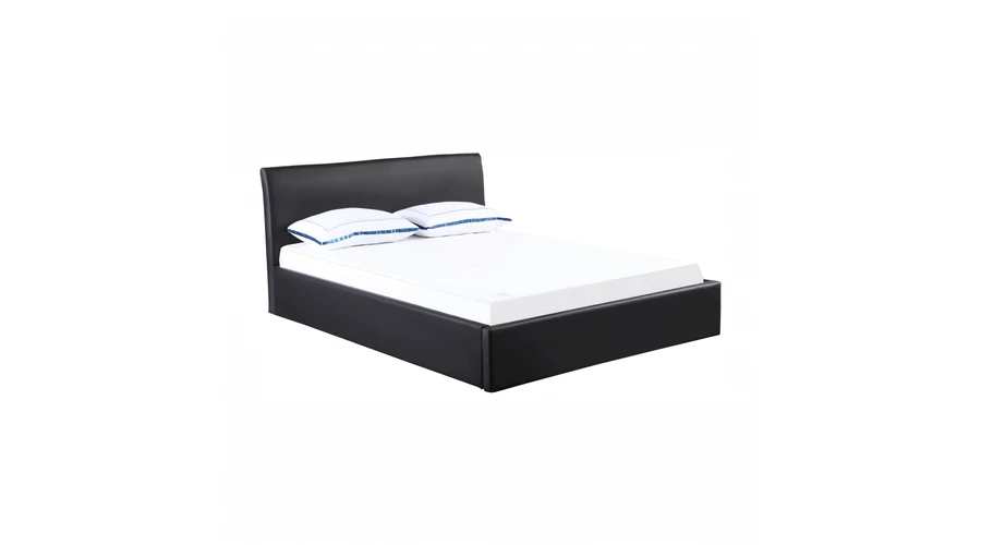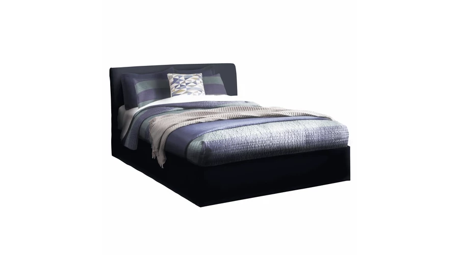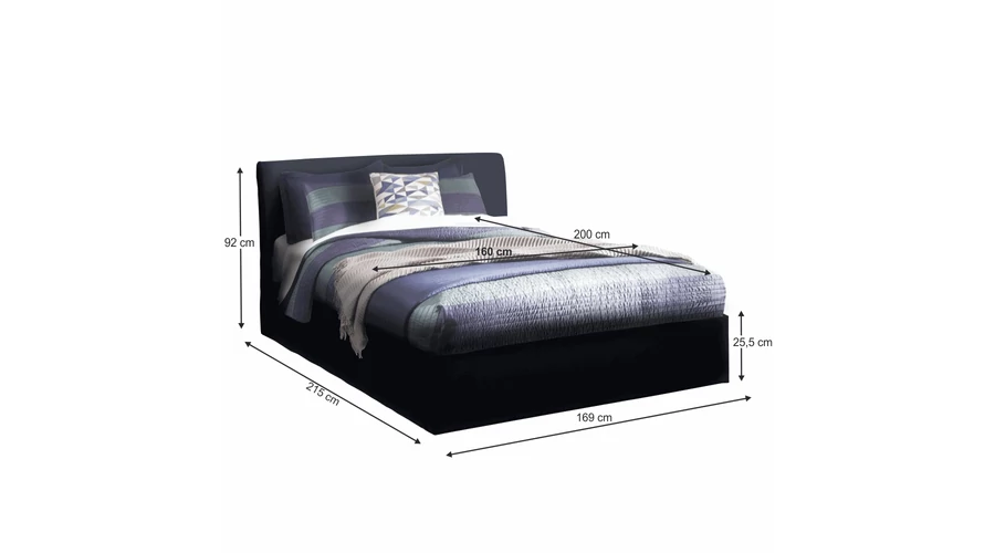 Ágy KERALA Anyag: műbőr A szövet kopásállósága: 100 000 Martindale Színe: fekete Méretek (SzéxMéxMa): 169x215x92 cm Fekvőfelület (SzéxH): 160x200 cm Magasság az ágyrácsig: 25,5 cm Billenő lamella ágyrács Rakodótérrel Szállítás matrac nélkül Rendelhető hozzá matrac Lapraszerelten szállítva